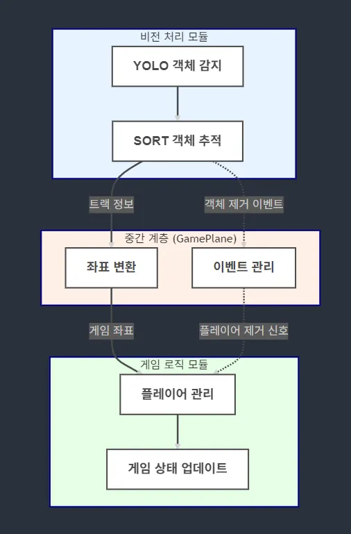 비전 처리 모듈과 게임 로직 모듈 간의 의존성을 최소화한 아키텍처를 설계 및 구현했습니다. 이 접근 방식으로 두 핵심 시스템 간의 원활한 통신과 동시에 각 모듈의 독립적인 개발 및 유지보수가 가능해졌습니다.