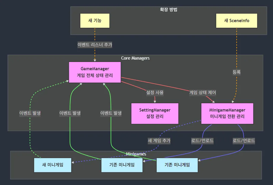확장성이 뛰어난 미니게임 구조를 설계했습니다. 이 구조는 중앙 시스템으로 전체 게임을 관리하며, 모듈식 접근 방식으로 개별 미니게임을 쉽게 추가할 수 있습니다. 새로운 미니게임이나 기능을 개발할 때 기존 시스템을 크게 변경하지 않고도 통합할 수 있어, 개발 효율성과 프로젝트의 유연성이 크게 향상되었습니다.
